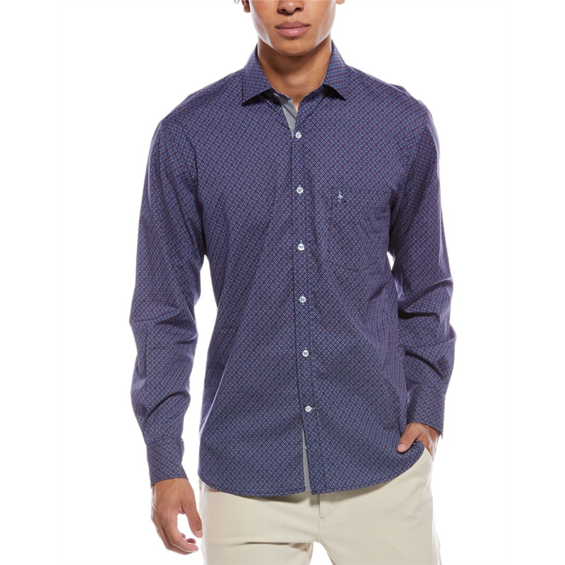 Introducing the TailorByrd Retro Geo Shirt, a stylish addition to any modern mans wardrobe. This shirt features a unique navy multicolor retro geometric pattern, perfect for adding a pop of color to your outfit. With a spread collar, left chest pocket, and shirttail hem, this shirt offers a classic yet fresh look. Made from a blend of 97% cotton and 3% elastane, it provides both comfort and stretch for all-day wear. Whether youre dressing up for a night out or keeping it casual for the weekend, the TailorByrd Retro Geo Shirt is a versatile choice. Dont miss out on this must-have piece from the brand known for classic menswear with a colorful twist.