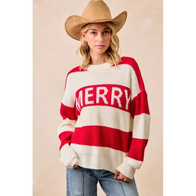 This festive pullover sweater features a bold MERRY text graphic across the chest, showcasing classic holiday spirit with vibrant red and cream white horizontal stripes. Crafted from soft ribbed knit material, this oversized sweater offers ultimate comfort and warmth for the winter season. The relaxed fit design makes it perfect for casual holiday gatherings, Christmas parties, or everyday festive wear. The premium knit construction ensures durability while maintaining a cozy feel. Ideal for layering or wearing alone, this statement piece combines holiday cheer with contemporary fashion styling.