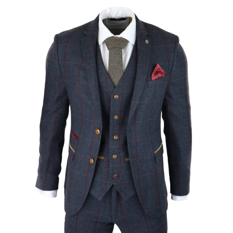 * Navy Blue Herringbone Tweed With Red Window Check Detailing, True 1920s Vintage Fashion With A Modern Twist