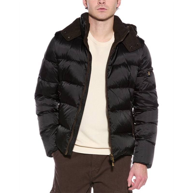 Introducing the MooRER Casciano Down Jacket, a versatile and stylish addition to your outerwear collection. This black jacket features a removable hood and contrast sleeves, as well as a removable fur trim at the collar for added warmth and style. The zippered pocket at the left sleeve and two zippered front pockets provide convenient storage options. Crafted with a shell of 100% nylon and a lining of 100% nylon, this jacket is filled with real down for superior insulation. The medium weight design makes it perfect for layering over your favorite outfits. Designed in Italy, this jacket is available in various sizes with a model height of 62 wearing a size 48. Please note that measurements may vary slightly by size. For best care, dry clean only. Elevate your cold-weather wardrobe with the MooRER Casciano Down Jacket.