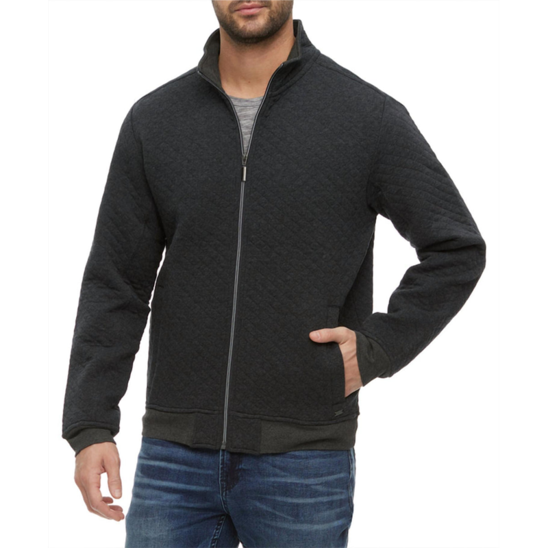 Introducing the Alloway Quilted Full Zip Jacket by Flags & Anthem, a performance piece designed for the modern man. This long sleeve jacket in a textured charcoal color is crafted from a 77% Cotton, 23% Poly blend, providing warmth and comfort with a tailored athletic fit. It features a zip closure, angled slit hand pockets, and a collar neckline for added style and functionality. With a length of 28.5 inches from the highest shoulder point, it’s machine washable and imported, making it a practical addition to your wardrobe. Ryan, who is 62 and 185 lbs, is wearing a size medium.