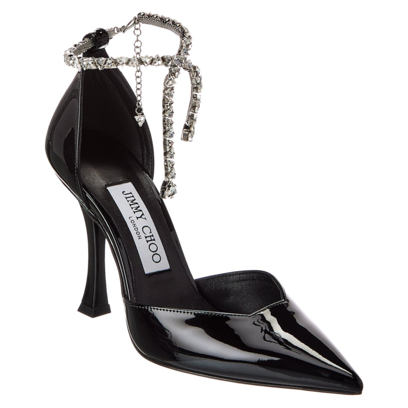Elevate your style with the Jimmy Choo Stevie 100 Patent Pump. Crafted in Italy with luxurious black patent leather and silver-tone hardware, these pumps feature a crystal-embellished ankle strap with a hook closure for a touch of glamour. The lightly padded leather insole and smooth leather sole provide comfort and support, while the 4-inch heel adds an elegant silhouette to any outfit. Please note that sizes are European, so it is recommended to reference the size chart for US conversions. Known for their exceptional Italian craftsmanship and playful sense of glamour, Jimmy Choo remains a leading luxury brand in the fashion industry. Add a touch of sophistication to your wardrobe with these classic pumps.
