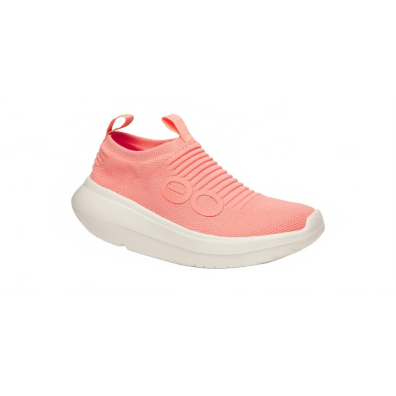 Cute, functional, and comfortable. These sneakers check all the boxes.Introducing the Womens Oomy Zen Shoe by OOFOS, a coral-hued sneaker designed for active recovery and ultimate comfort. Featuring an impact-absorbing OOfoam technology within its advanced footbed geometry, this shoe offers unparalleled relief with every step. Its 360-degree seamless knit upper ensures a pressure-free, sock-like fit, complemented by zen bands for a secure feel. Lightweight and packable, it’s perfect for travel, and the easy-care design allows for machine washing and air drying.