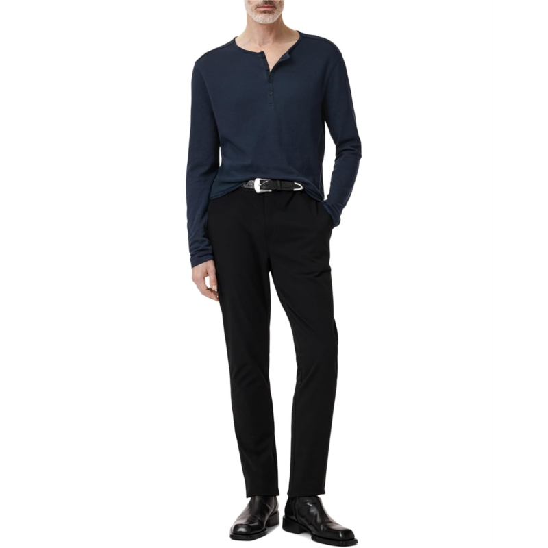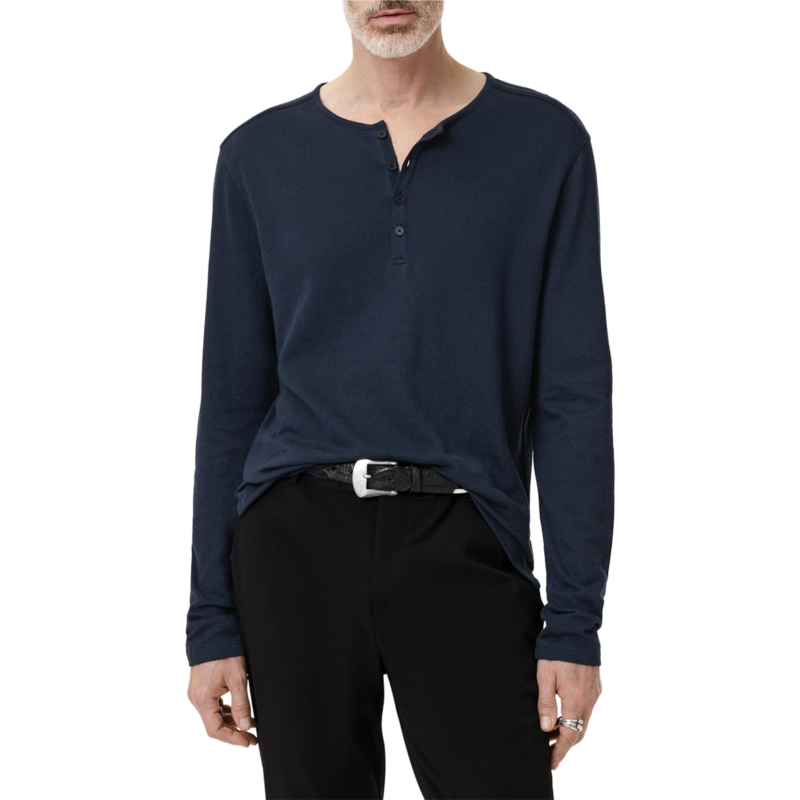 Flaunting attractive blend of textures and unique broken stitch details, the John Varvatos Walden Henley T-shirt that is thoughtfully crafted with super fine pima cotton and finished with signature flag label branding. The tee features a henley crew neckline, half-button placket accentuated with woven detail, long sleeves, and straight hem with side splits.