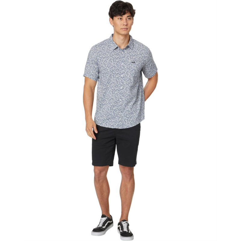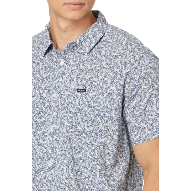 Rev up the city street trends in your fashionable look wearing RVCA Micro Garden S/S Shirt. It features a collared neckline, short sleeves, button-down front closure, and scalloped hem.
