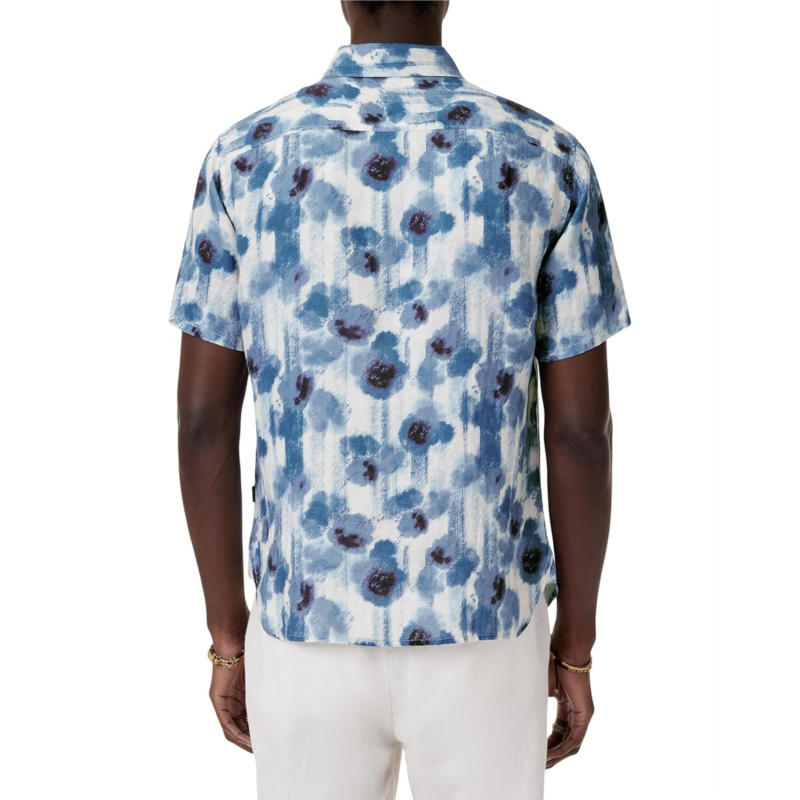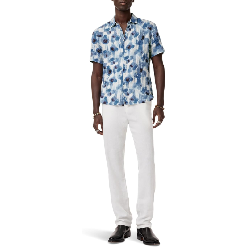 Crafted from washed linen with a soft texture, the John Varvatos Sean Short Sleeve Shirt W780S25 features an oversized abstract floral print. Its breezy construction and bold design make it a standout piece for your casual warm weather attire.