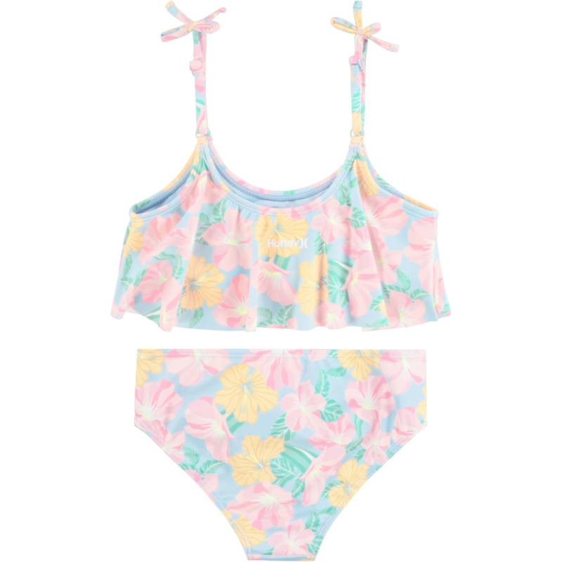 Get ready for a fabulous beach day in this Hurley Kids Flounce Bikini, featuring an eye-catching flowy top and vibrant prints. Don''t forget the sunscreen - the beach is calling! This is a two-piece suit and consists of a flounced top and regular-cut bottoms. The top has a scoop neckline, self-tie shoulder straps with adjustable sliders, and a cropped straight hem. The bottoms feature an elasticized waistband and moderate coverage.
