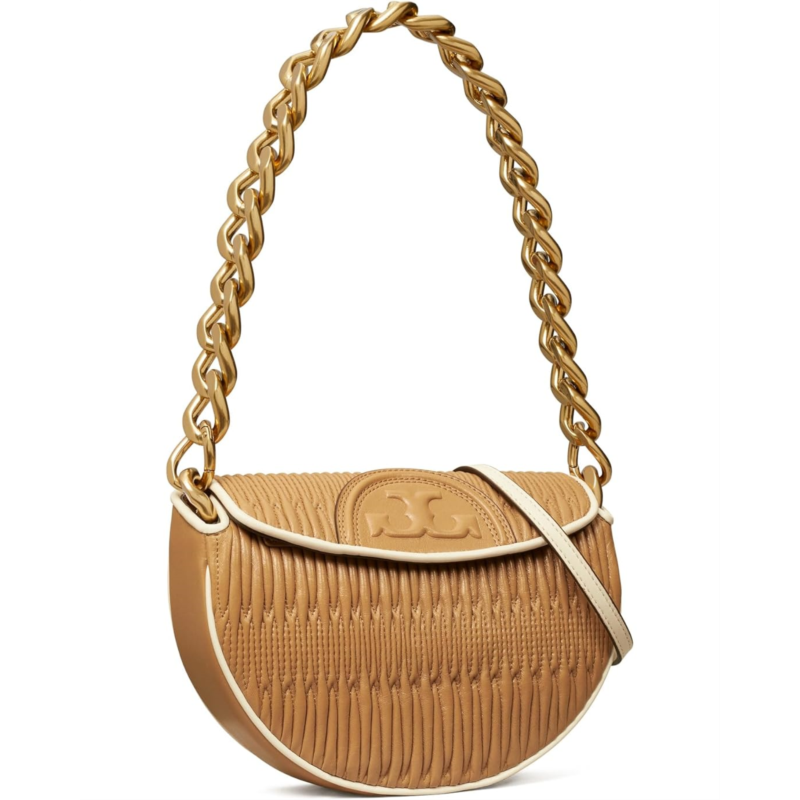 Get noticed every time carrying the classy Tory Burch Fleming Soft Pleated Mini Crescent Bag. Crafted from leather, this shoulder bag features pintuck quilting technique allover, shiny hardware, magnetic snap closure, chunky chain shoulder strap, adjustable, and removable leather crossbody strap. It has two interior card pockets.