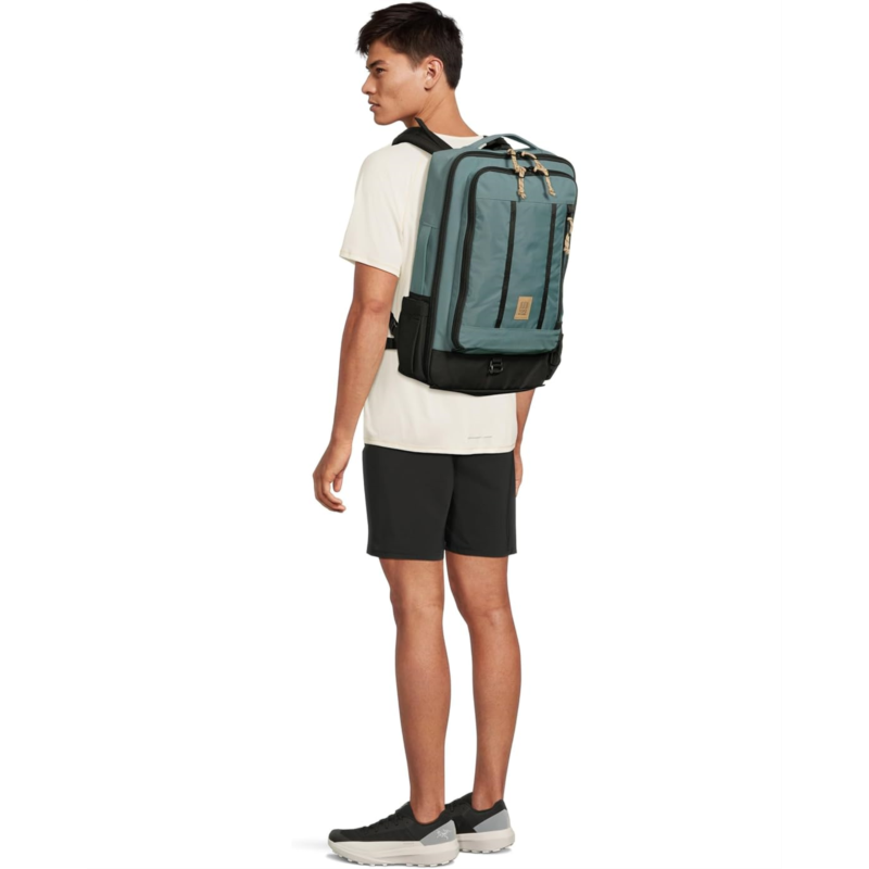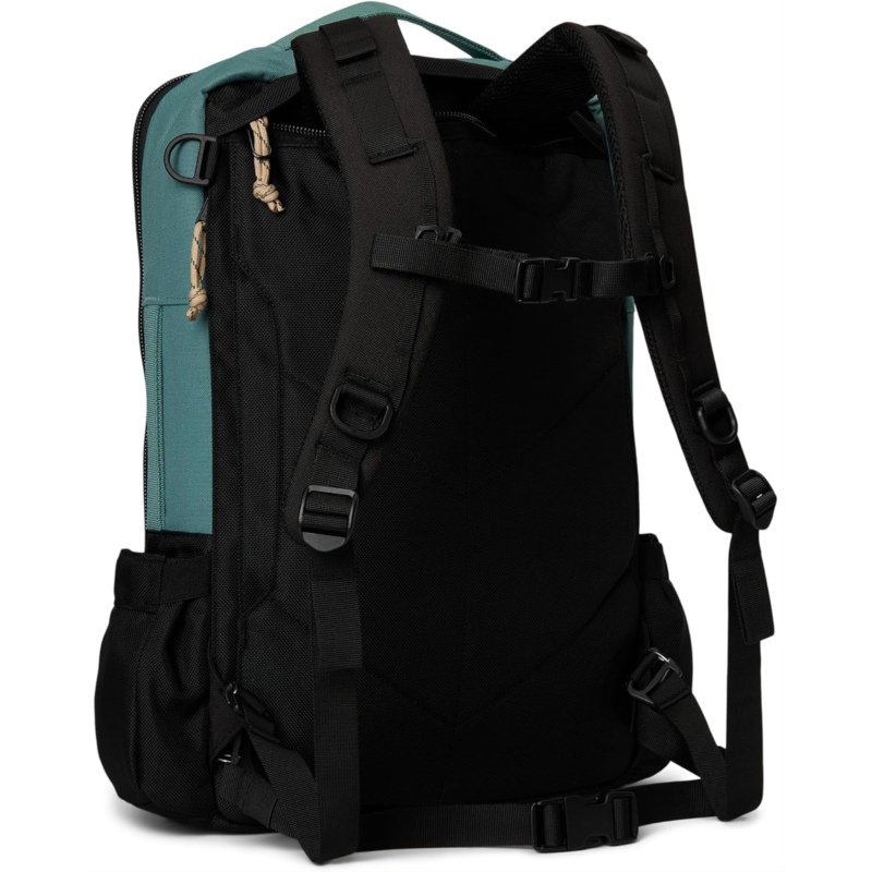 Travel with confidence carrying all your stuff in the Topo Designs Global Travel Bag 30L. Crafted from plastic and nylon this bag features large u shape opening with internal mesh organization pockets, easy access to back panel laptop compartment, pass-through panel that secures bag to rolling luggage handle, expandable side water bottle pockets, back panel laptop compartment for 15'' laptops, and stowable contoured padded spacer mesh shoulder straps. It also comes with