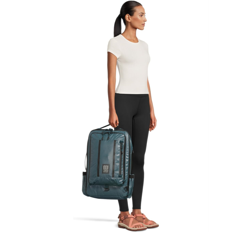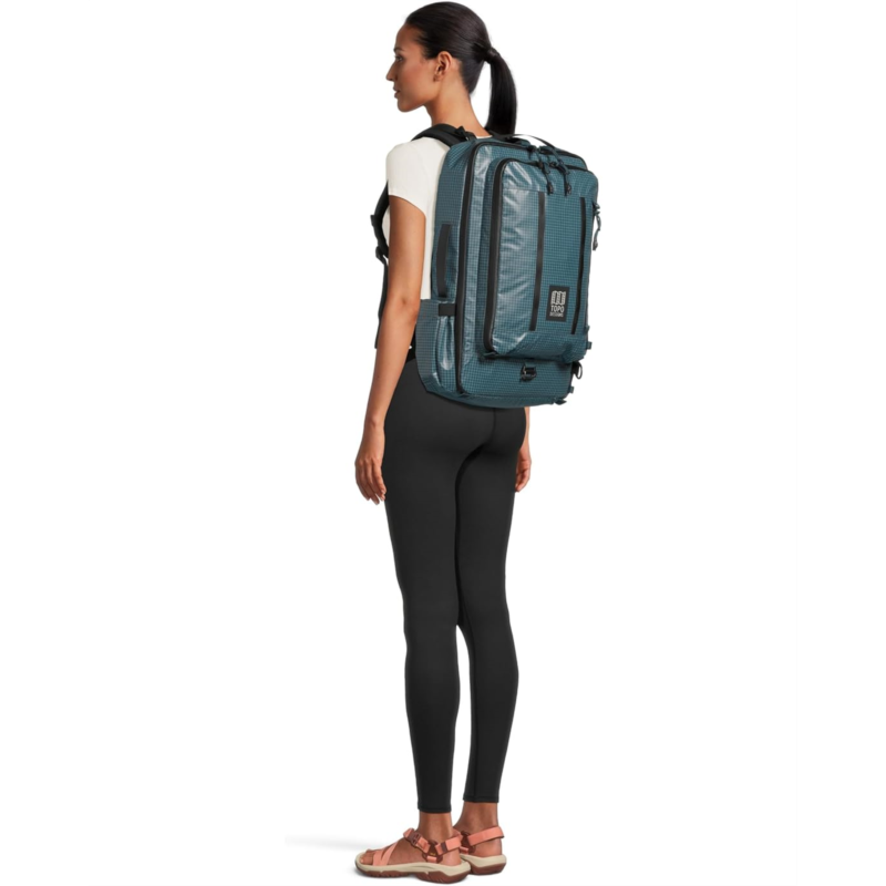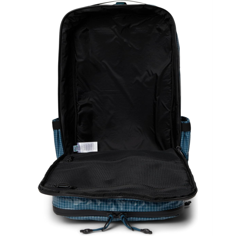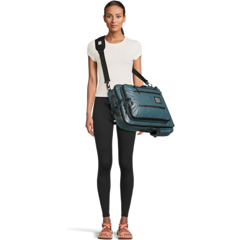 An ideal one-bag travel companion, the carry-on compliant Topo Designs Apex Travel Bag 30l features weatherproof recycled ripstop nylon material, waterproof YKK zippers, and silicone-coated handles for durability. Agile and versatile with 3-way carry options, this travel backpack comes with internal organization, expandable side pockets, and an external 15-inch laptop compartment. It features a U-shaped entry to the spacious main compartment and a pass-through panel for rolling luggage attachment. This laptop backpack is designed with stowable padded shoulder straps, load-lifter straps, a sternum strap, and a removable waist belt for versatile carrying options. It meets airline carry-on requirements. Ideal for a long weekend getaway, it seamlessly integrates with the modular carry system for maximum versatility.