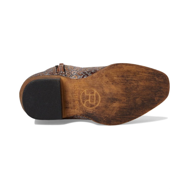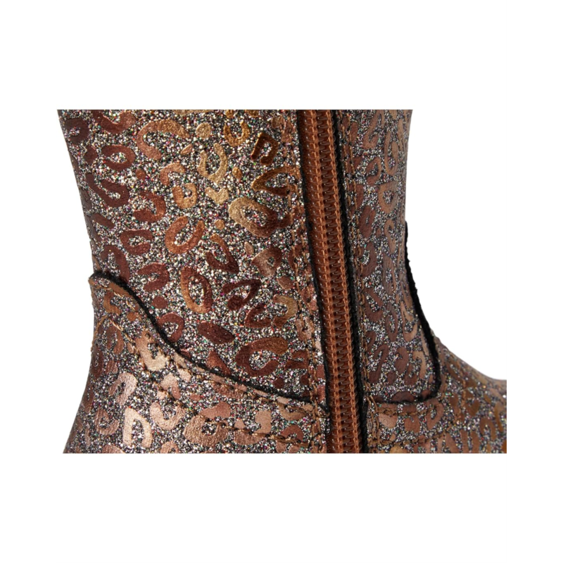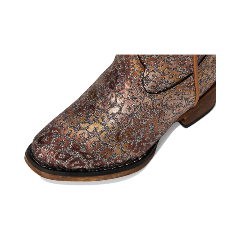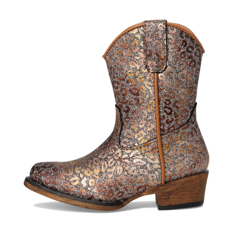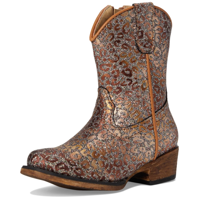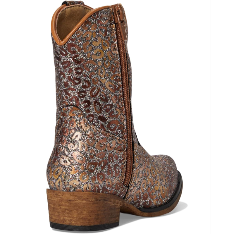 The Roper Kids Riley Leopard Western Boots exude a shimmery look with glitter synthetic upper and allover leopard print pattern. Featuring a snip toe shape, the mid-calf footwear has nylon lining, padded comfort insole, and zippered side closure.