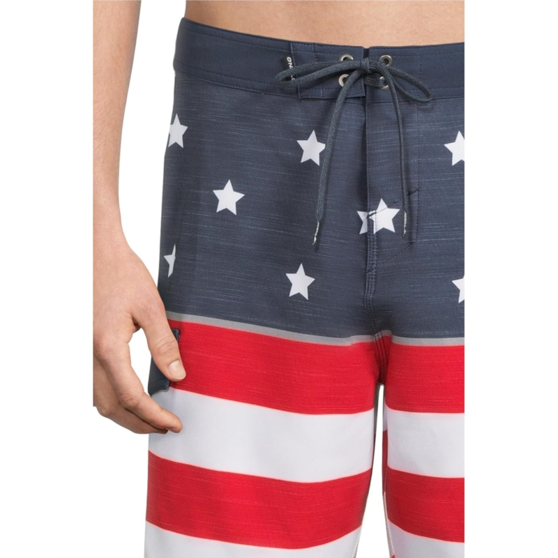 The O''Neill Lennox USA 20'' boardshorts are built for the modern adventurer who craves comfort, performance, and standout style. Featuring bold printed designs and a secure drawstring closure, these trunks are all about making moves with confidence. Crafted from O''Neill Blue four-way stretch fabric infused with recycled fibers, they offer eco-conscious flexibility that moves with you. Stay light and dry thanks to O''Neill Hyperdry DWR technology, designed for ultra-fast water resistance. The side pocket adds convenience, while rash-free Hyperthread ensures smooth, chafe-free wear from sunrise surf to sunset chill.