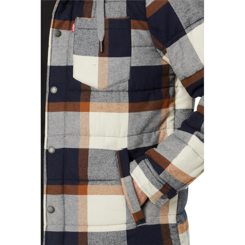 Keep yourself warm and exude a refined style wearing Levi''s Cotton Plaid Quilted Puffer Jacket. The classic-fit jacket features an attached hood with drawstring, long sleeves with adjustable tab, center-front zipper & snap-button closure, and allover plaid pattern. The one patch pocket on the left chest and two lower-front pockets allow easy storage.