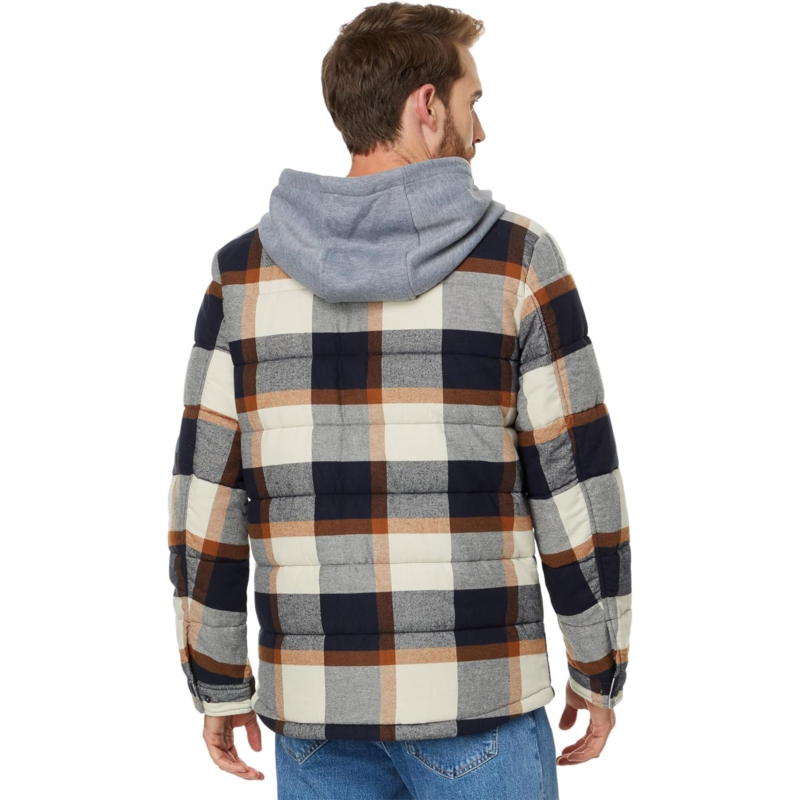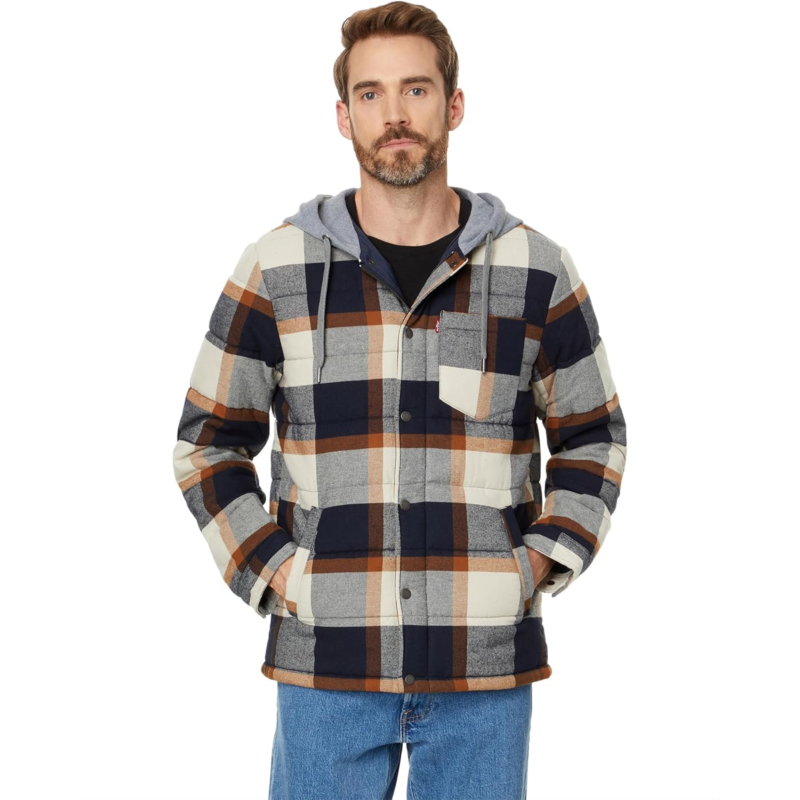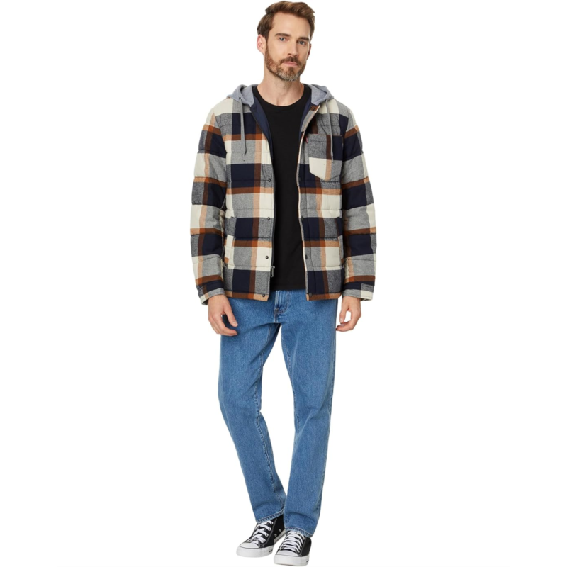 Keep yourself warm and exude a refined style wearing Levi''s Cotton Plaid Quilted Puffer Jacket. The classic-fit jacket features an attached hood with drawstring, long sleeves with adjustable tab, center-front zipper & snap-button closure, and allover plaid pattern. The one patch pocket on the left chest and two lower-front pockets allow easy storage.