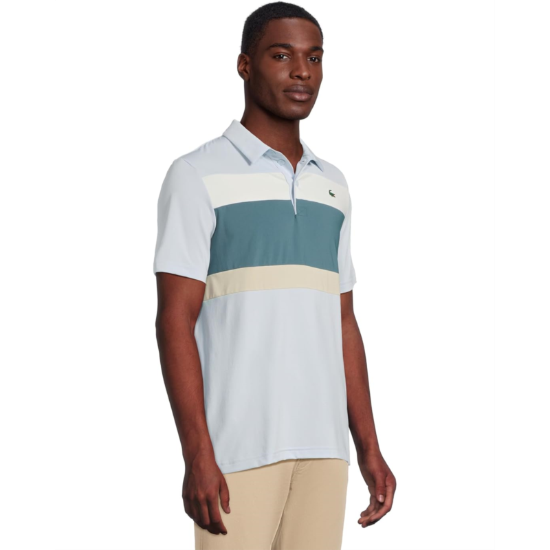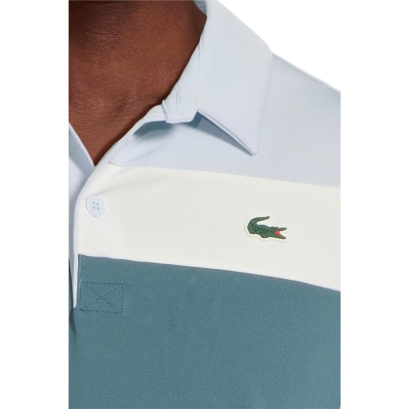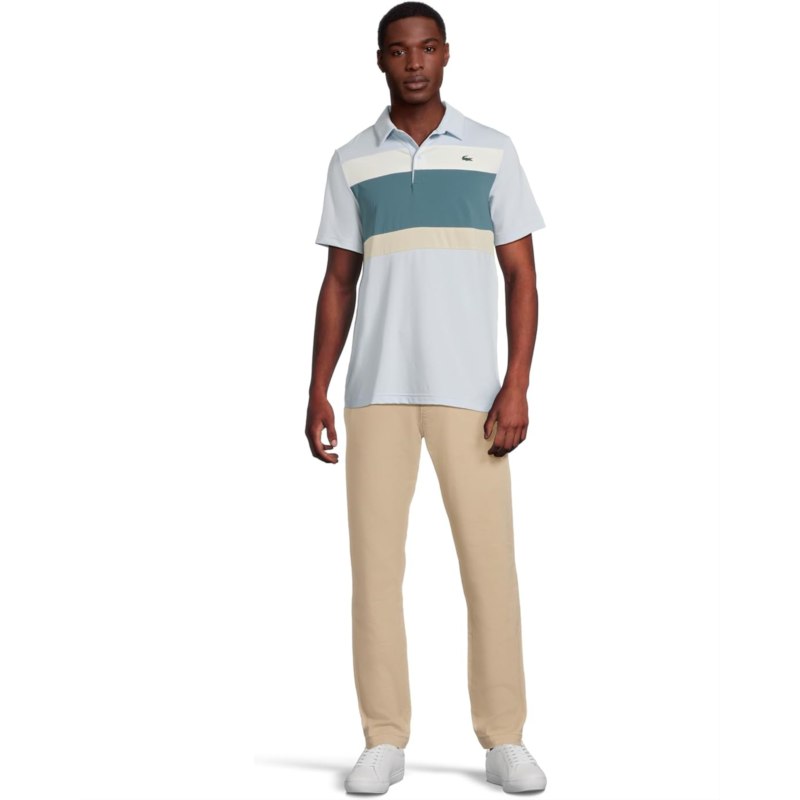 Focus on your swing only with the Lacoste Regular Fit Colorblock Polo made with ultra-dry and stretch properties as well as UPF50+ protection. Its slim, tailored fit offers a sharp, contemporary silhouette while allowing freedom of movement, while the vibrant colorblock design brings a modern twist to a timeless classic, perfect for any casual occasion. Crafted from soft, breathable cotton, this polo delivers all-day comfort with a refined, sporty edge. The buttoned front closure ensures easy wear. This button-down polo is styled with short sleeves, a collared neckline, and a straight hem. Its soft ribbed collar and cuffs complete the polo with a sleek, polished finish. This polo shirt is finished with the signature Lacoste crocodile logo on the chest, adding an iconic touch of heritage.