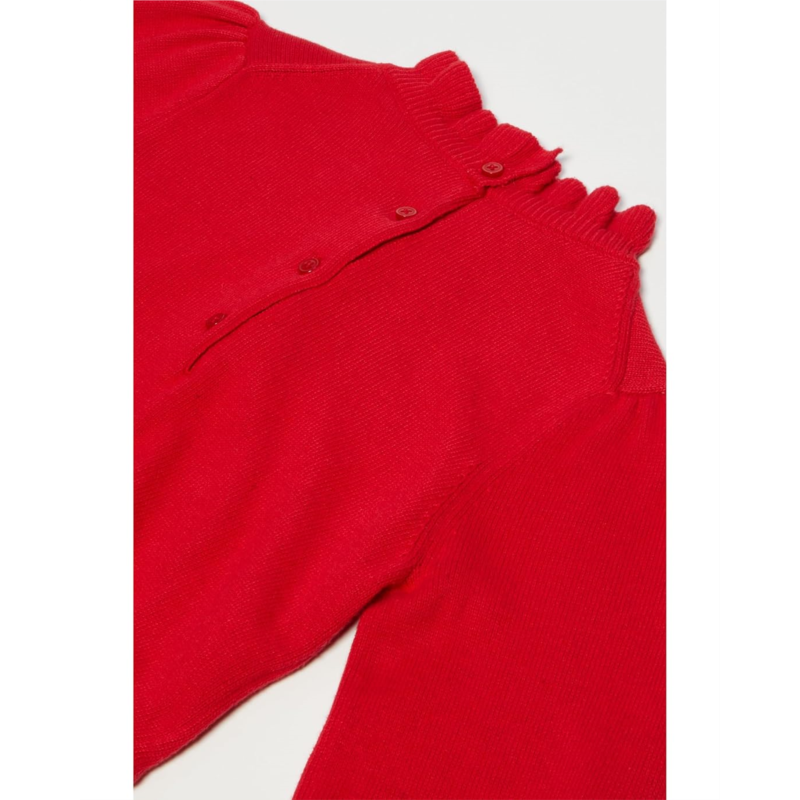 - The Janie and Jack Sweater Dress is designed with a ruffled crew neckline, decorative bow, and pearl button placket on the front. It features a buttoned back closure and long sleeves with smocked cuffs.