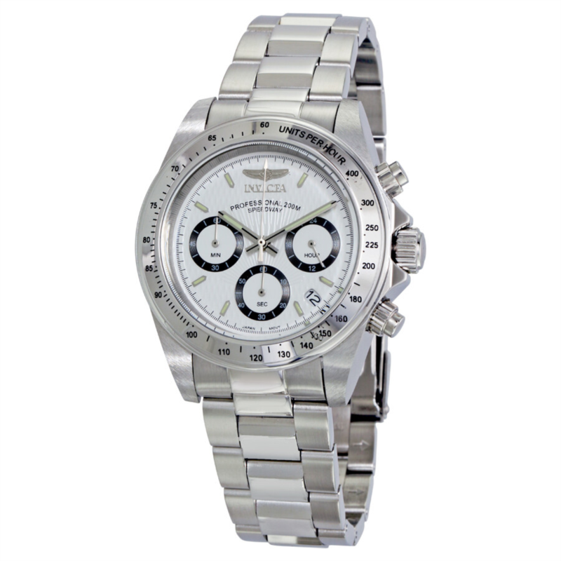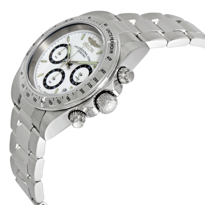 Stainless steel case with a stainless steel bracelet. Fixed stainless steel bezel showing tachymeter markings. White dial with trinite luminous hands and stick hour markers hour markers. Minute markers around the outer rim. Dial Type: Analog. Luminescent hands and dial markers. Date display between the 4 and 5 o''clock positions. Chronograph - three sub-dials displaying: 60 seconds, 60 minutes and 24 hours. Japanese quartz movement. Scratch resistant anti-reflective mineral crystal. Screw down crowns. Screw down stainless steel case back. Case diameter: 40 mm. Case thickness: 13 mm. Round case shape. Band width: 20 mm. Fold-over clasp with a safety release. Water resistant at 200 meters / 660 feet. Functions: second, chronograph, tachymeter, date, hour, minute. Sport watch style. Watch label: Japan Movt. Invicta Speedway Men''s Watch 9211.