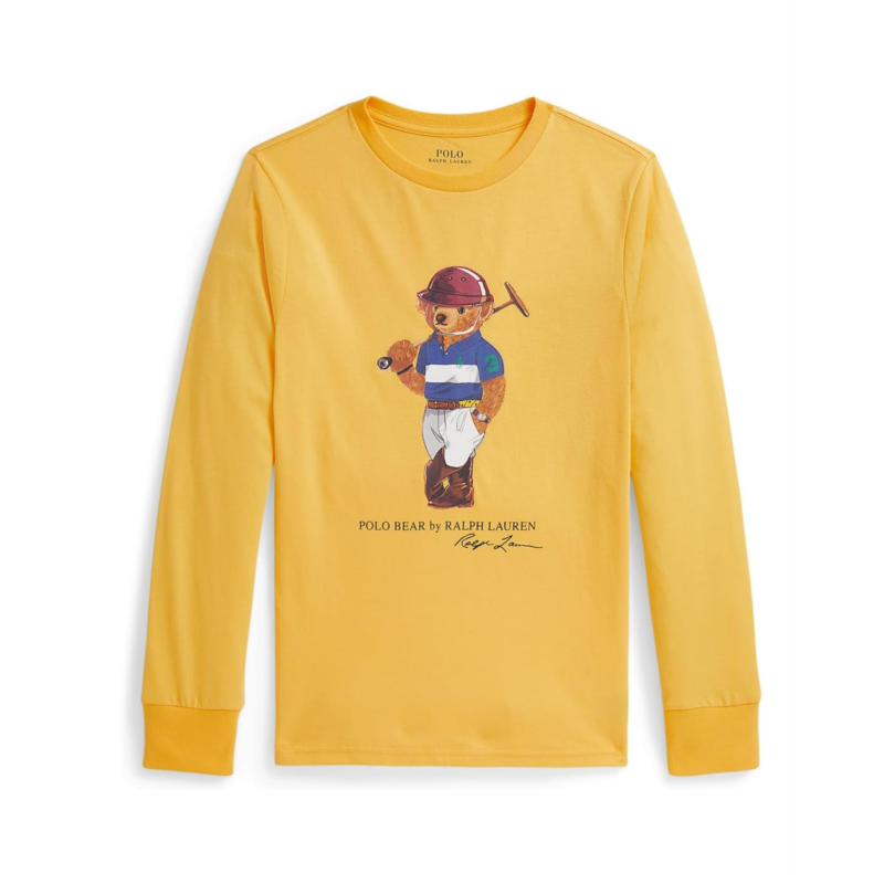 - On this Polo Ralph Lauren Kids Polo Bear Cotton Long-Sleeve Tee, our iconic Polo Bear wears a signature Ralph Lauren outfit while walking a bulldog. The jersey tee features a ribbed crew neckline, long sleeves with ribbed cuffs, and a straight hem. By choosing our cotton products, you''re supporting our investment in the Better Cotton mission to help cotton communities survive and thrive, while protecting and restoring the environment. This product is sourced via a system of mass balance and therefore may not contain Better Cotton. Visit bettercotton.org/massbalance for more information about mass balance.