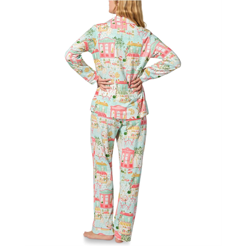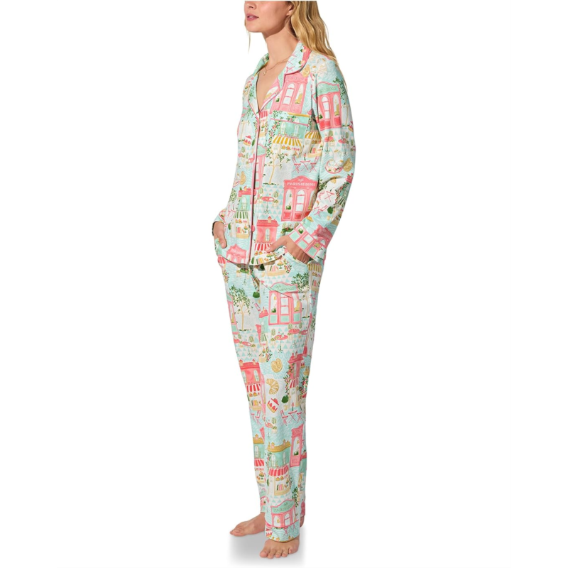 The BedHead Pajamas Long Sleeve Classic Stretch Jersey Pj Set features a classic button-down top with a notch collar and contrast piping for a polished look. The elasticated pull-on pants offer a relaxed fit, complete with side pockets for added ease.