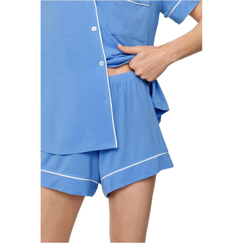 IMPECCABLE SHORTS: This relaxed pajama set comes with a boyfriend fit pajama shorts with longer rise and contrast piping above the hemline for a comfortable fit.