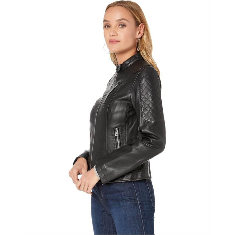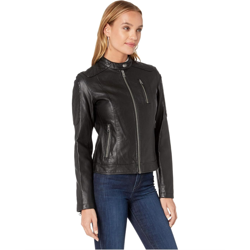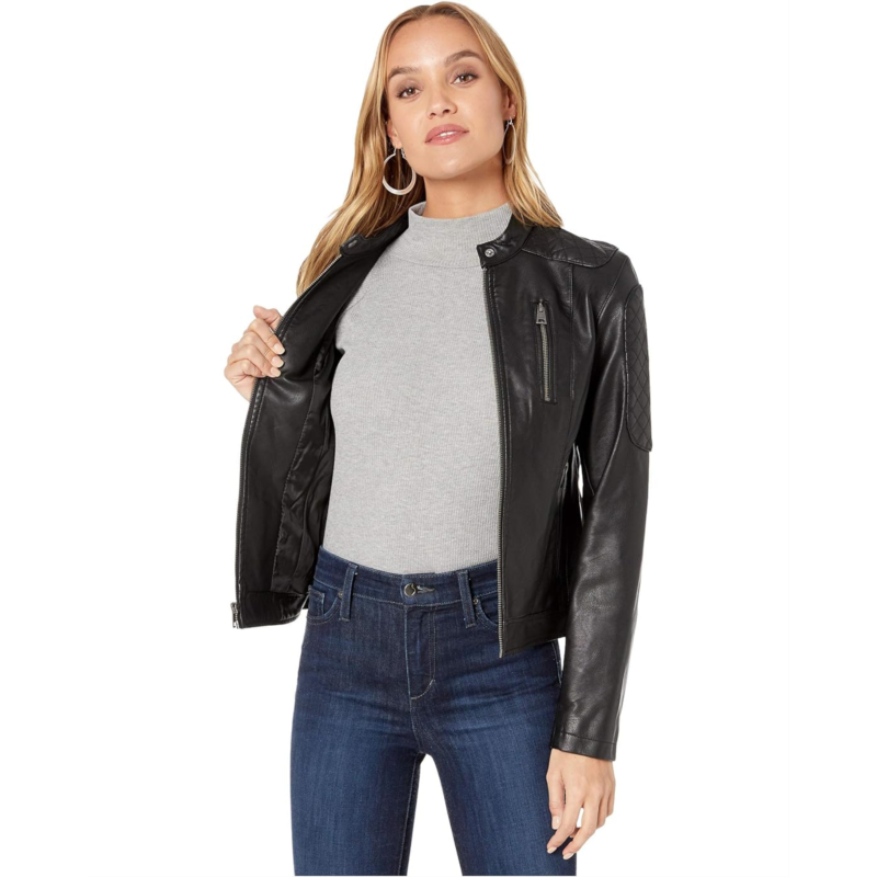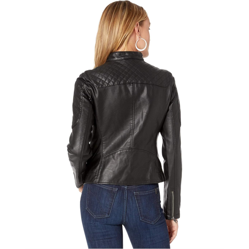 Supple faux leather boasts quilted detailing at the sleeves that lend to an edgy appeal.