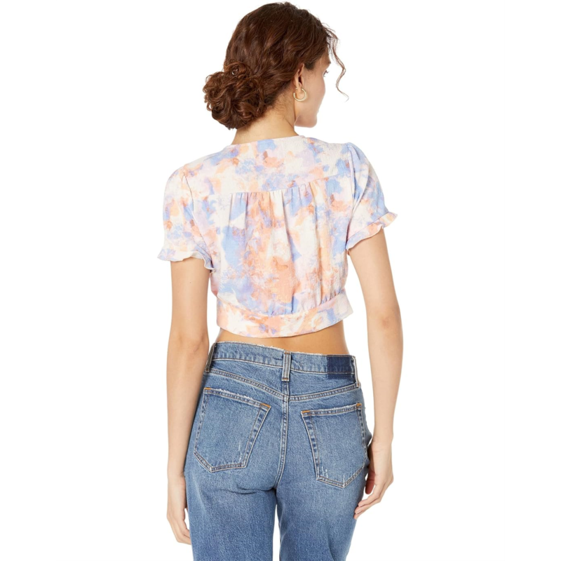 Tie-dye print top featuring V-neckline and short sleeves with ruffled edges.