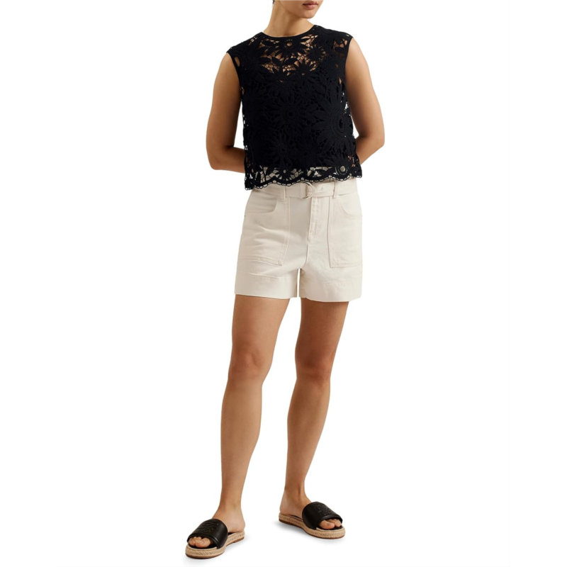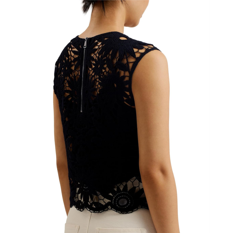 Make a summer statement wearing the Ted Baker Katrnn Crochet Knit Top. Sleeveless top has open knit floral design, featuring a sweet scallop hem with picot trim. The bust is lined for a more wearable style, leaving the neckline sheer to make the pattern pop. A crew neck and center-back zipper closure give it a straight fit.