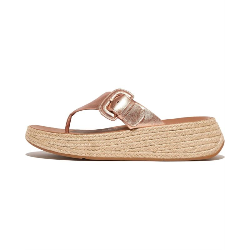 Elevate your comfort in true sense wearing the FitFlop F-Mode Espadrille Adj. Leather Flatform Toe-Thongs. It features leather upper, lining, and footbed. A sleek strap is cut to flatter the foot on a wedge heel. The thongs are crafted in soft shimmering metallic leather, with a leather-covered half-moon buckle.