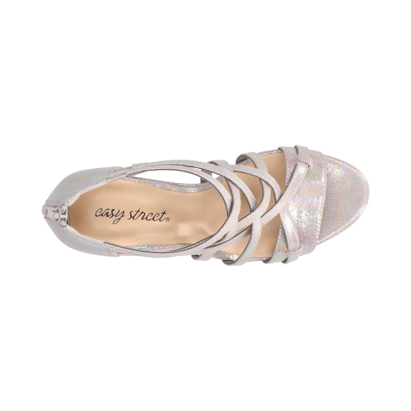A sleek and strappy faux leather upper with an open round toe and a stable stiletto heel adds contemporary elegance and charm to the Easy Street Bee Heels. Versatile and comfortable, these shoes are designed with gored elasticized straps for a flexible fit, a zippered back closure for easy on and off, and a foam padded insole for cushioning comfort.