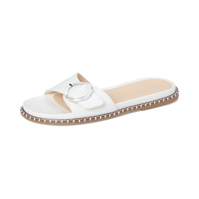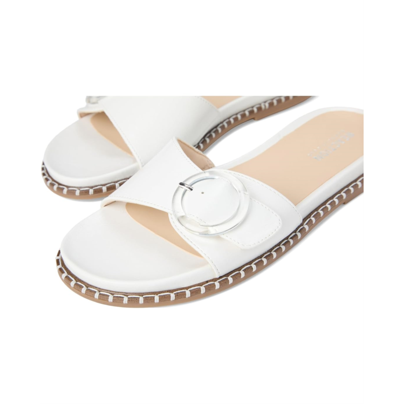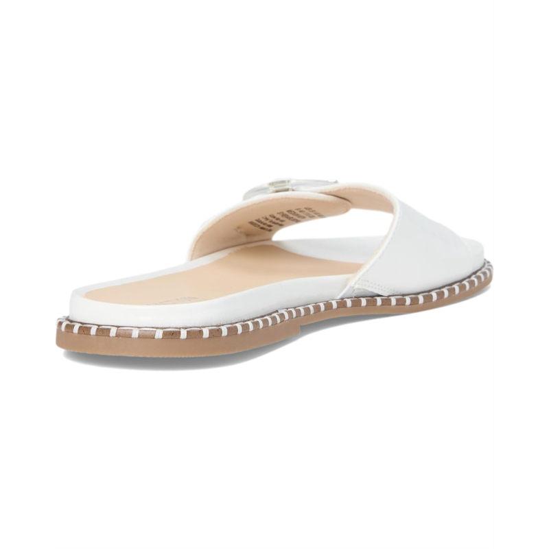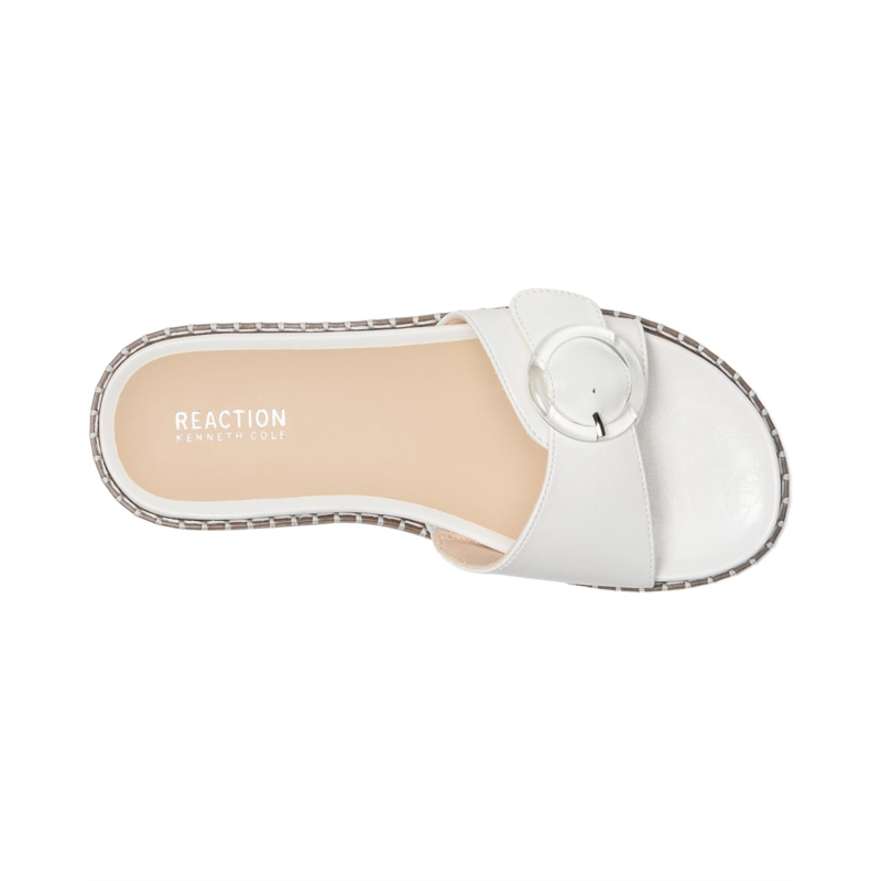The Kenneth Cole Reaction Syrena is a comfortable flat sandal with buckle detail and added footbed-like cushioning. This slip-on footwear is designed with a faux leather upper strap and a stylish buckle.