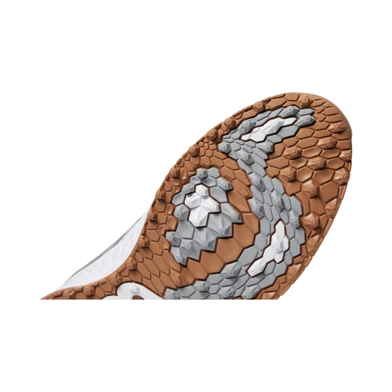 Smart rubber spikeless outsole has pressure mapping colors to highlight key performance