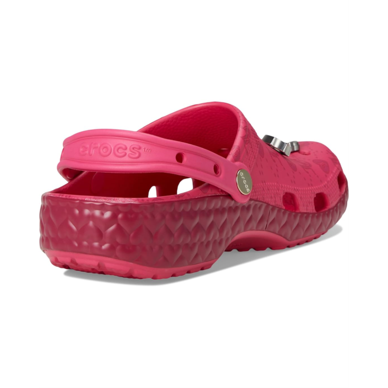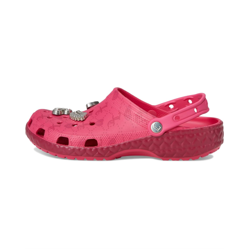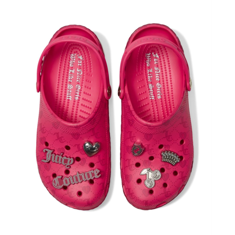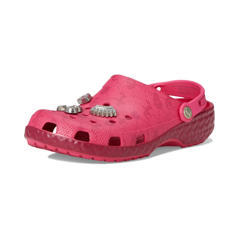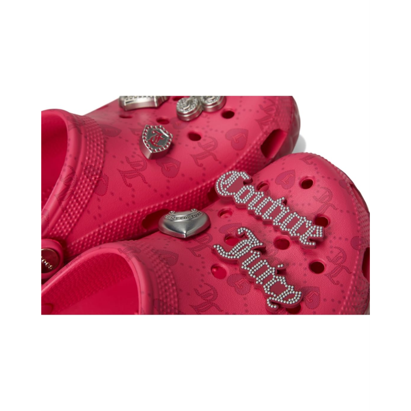 The Juicy Couture collection has arrived, and comfort has never felt so luxurious! This hot pink Classic Clog shows off a monochrome color scheme with subtle design details like an embossed heart pattern around the sole and a Juicy Couture all-over logo print on the clog''s upper. Six metal and bedazzled Jibbitz charms adorn the clog because it wouldn''t be Juicy Couture without a bit of glamour, of course!