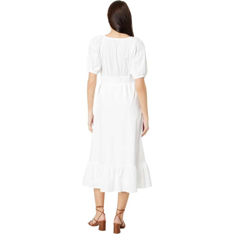 - Keep your uber-chic style on point wearing Vineyard Vines Poplin V-Neck Midi Dress that features a midi-length and an A-line silhouette. The dress features a lightweight poplin fabrication, V-neckline, elbow-length puff sleeves with elastic cuff, elasticated detailing on the waist, and a tiered skirt.