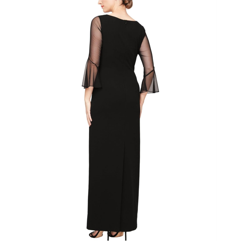 - Steal the spotlight with your effortless charm by wearing the gorgeous Alex Evenings Long Column Dress with Mesh Bell Sleeves and Heat Set Neckline.