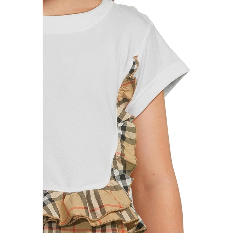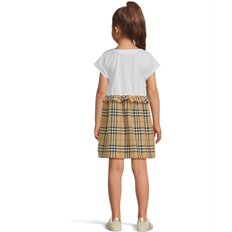- Twirl into timeless style wearing Burberry Kids Rhonda Frill Dress. Designed in a regular fit with a soft crew neck and breezy short sleeves, this knee-length beauty offers all-day comfort with its effortless pull-on construction, perfect for little fashion icons on the go. The short-sleeved bodice flows into a beautifully gathered skirt adorned with delicate ruffling and the signature Burberry Check, creating an enchanting silhouette that moves with every twirl.