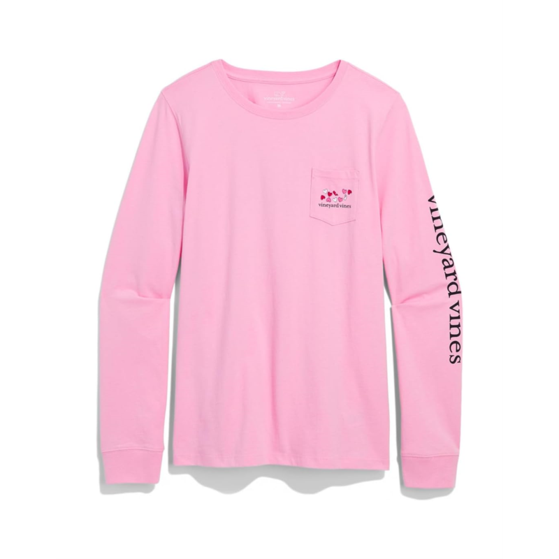 - Showcase that elegant finesse wearing the vineyard vines Long Sleeve Pocket Tee. It features a crew neckline and long sleeves with ribbed cuffs. The rounded hem adds a modern touch, while the graphic print on the sleeve, back, and chest pocket gives it a unique and trendy look.