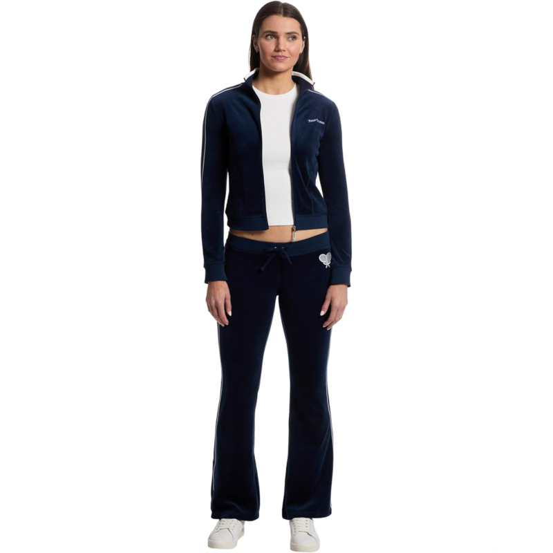 Velvet reverie: Juicy Couture Heritage Low Rise Track Pants With Side Stripe. Crafted from ultra-soft cotton velour, these track pants redefine sporty-chic with a high-rise fit, sleek flat front, and pull-on ease. The adjustable drawcord closure ensures the perfect fit, while the striped side trim adds a pop of retro-cool energy. Whether youre channeling 90s nostalgia or elevating your athleisure game, this piece is a must-have from the exclusive tennis capsule.