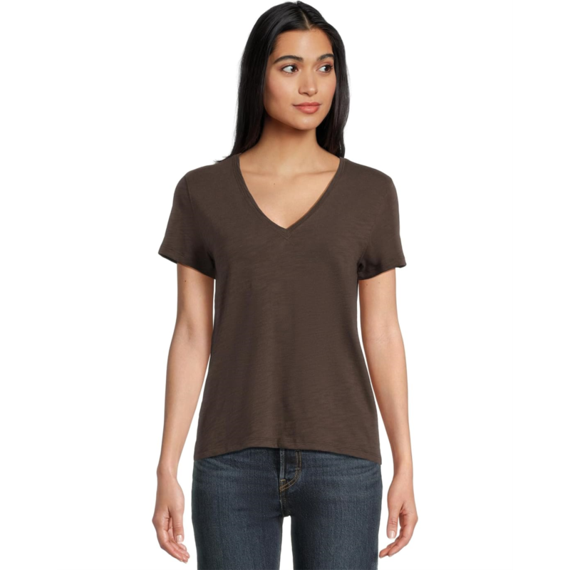- The Lilla P Short Sleeve Back Seam V-neck Top in midweight structured knit fabric combines comfort and style with unique details. The pull-on style tee features a V-neckline, short sleeves, and a straight hem.