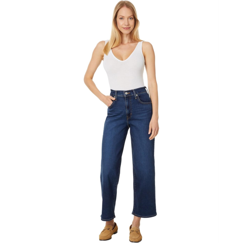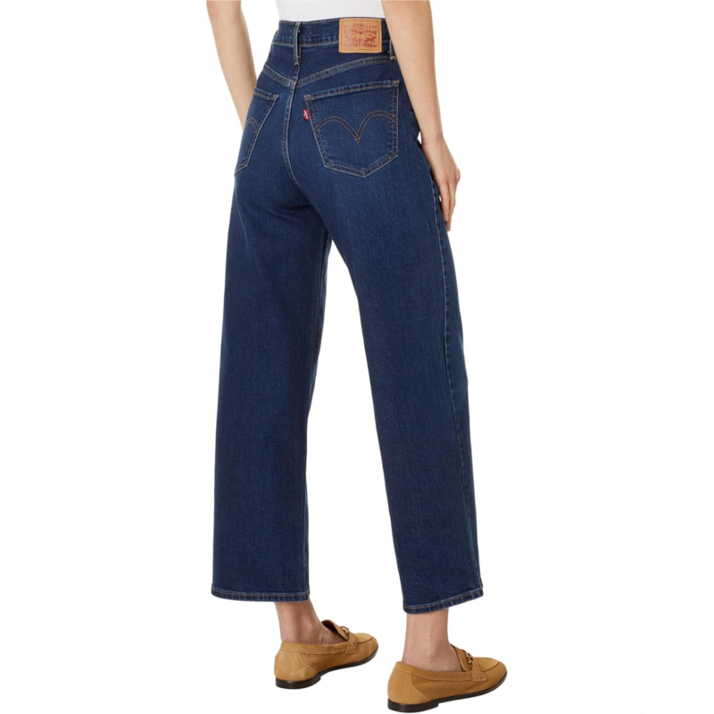 Feel free while moving outdoors from morning to night wearing Levis Premium High-Rise Wide Leg jeans. It has flattering high-rise waist, and waistband with loops. A loose fit, dark fabric wash, and classic five pockets with branding patch at the back waistband; make the jeans comfortable for daily life. It has front zip-fly and button closure. Crafted with a hint of stretch, the jeans is finished with ultra-modern wide leg.