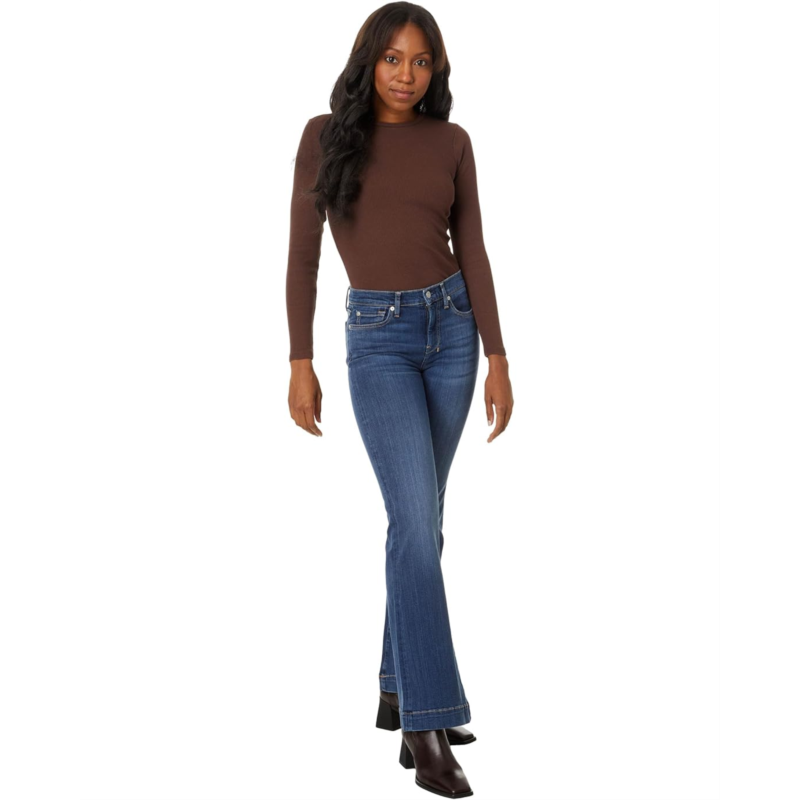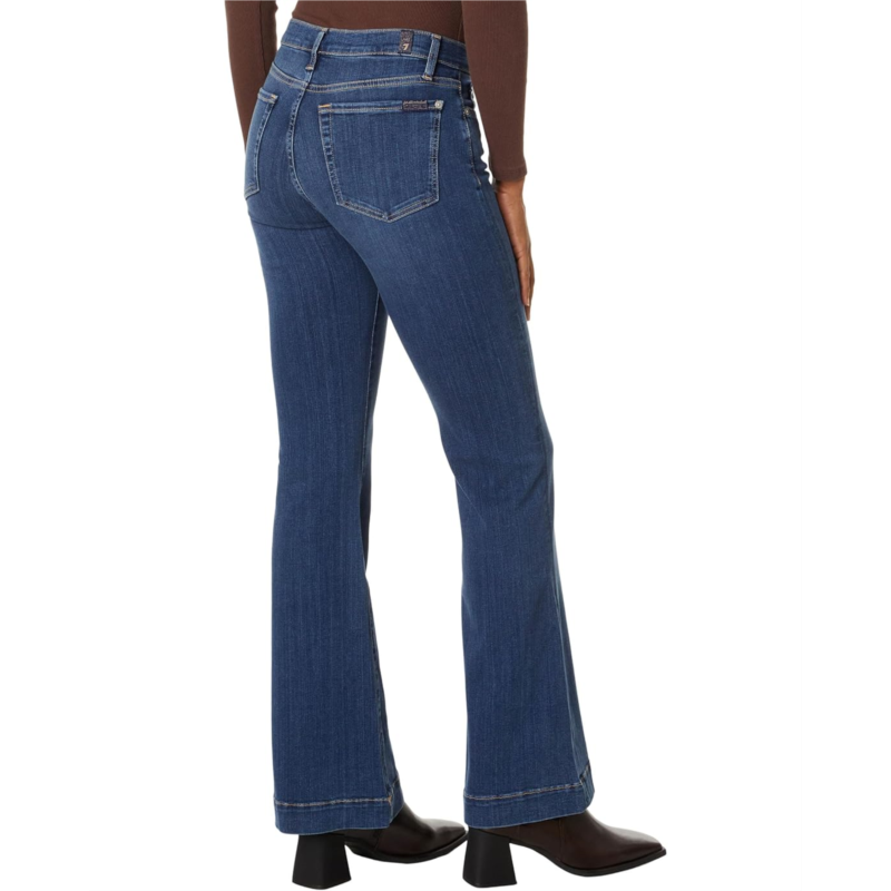 The 7 For All Mankind Tailorless Dojo jeans are signature wide-leg trouser jeans now with a shorter inseam. These long, leankorea jeans are crafted from signature 9 oz. stretch denim, which slims and sculpts for a flattering look. Designed in a flared-leg silhouette with a mid-rise waist and flat front, these stretchable jeans offer a flattering fit. They are finished with a zip-fly, buttoned closure, and belt loops. These mid-rise denim jeans make a great addition to your wardrobe.