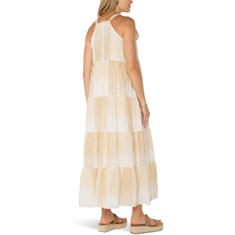 The Liverpool Los Angeles Tie Strap Easy Fit Woven Maxi Dress perfectly blends style and breezy comfort. Made from a lightweight printed woven fabric with fray details, this maxi dress is styled with a tiered silhouette and tie closure. Its chevron pattern and lightweight fabric make it your go-to piece for a relaxed yet polished look. This printed dress comes with a round neckline and a tiered hem. Ideal for everything from casual beach days to garden parties, this sleeveless dress can be dressed up with heels or kept laid-back with sandals.
