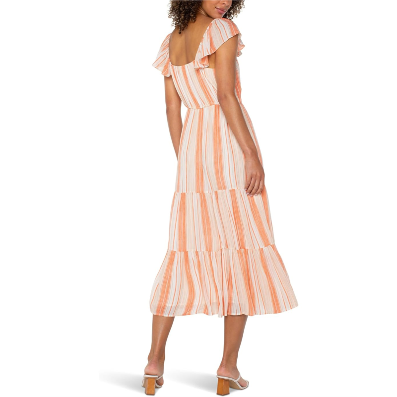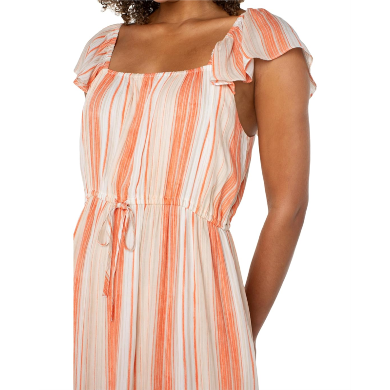 Experience the ultimate in comfort and style with Liverpool Los Angeles Flutter Sleeve Woven Maxi Dress With Cinched Waist. The pull-on style dress features a squared neck, short flutter sleeves, a tie-up waist detail, and a maxi-length silhouette. Its beautiful orange-tan stripe design is perfect for adding a touch of elegance to any warm day.