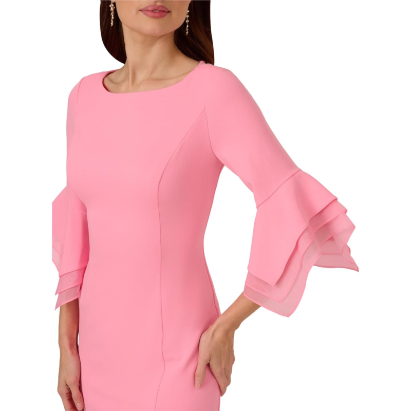 Elegance redefined with the Adrianna Papell Knit Crepe Tiered Sleeve Dress. Embrace timeless sophistication in this midi marvel with a boat neckline, fitted silhouette, and tiered bell sleeves. Crafted from knit crepe for comfort and stretch, featuring a zipper back closure, no waist seam, and a single pleat. Solid pattern, bow embellishment, quarter sleeves ? redefine your style effortlessly.