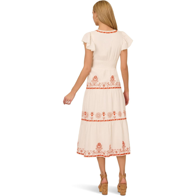 Effortlessly breezy and beautifully detailed, the Adrianna Papell Smocked Waist Long Dress is crafted from cotton, making it lightweight and breathable for all-day wear. The flutter sleeves add a touch of charm and movement, while the stretch smocked waistband ensures a flattering fit thats as comfortable as it is stylish. This embroidered midi dress is styled with a V-neckline, tiered skirt, and embroidered details. Perfect for warm-weather outings or casual gatherings, this dress combines ease and elegance in one timeless design.