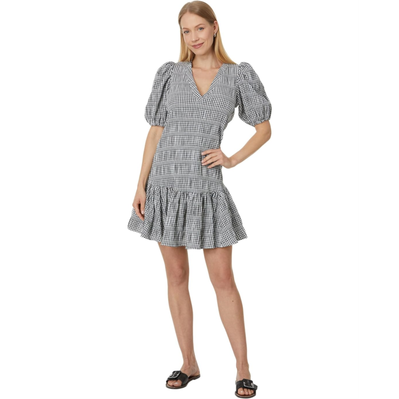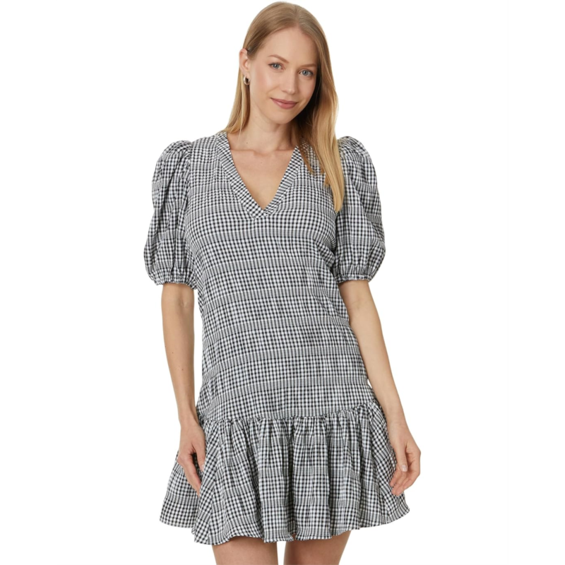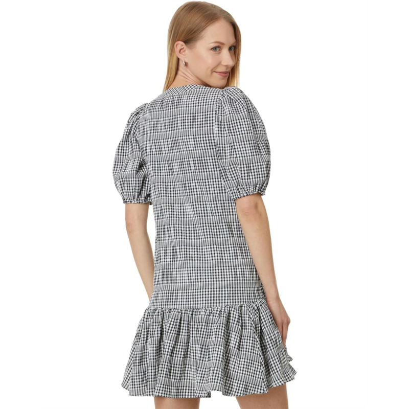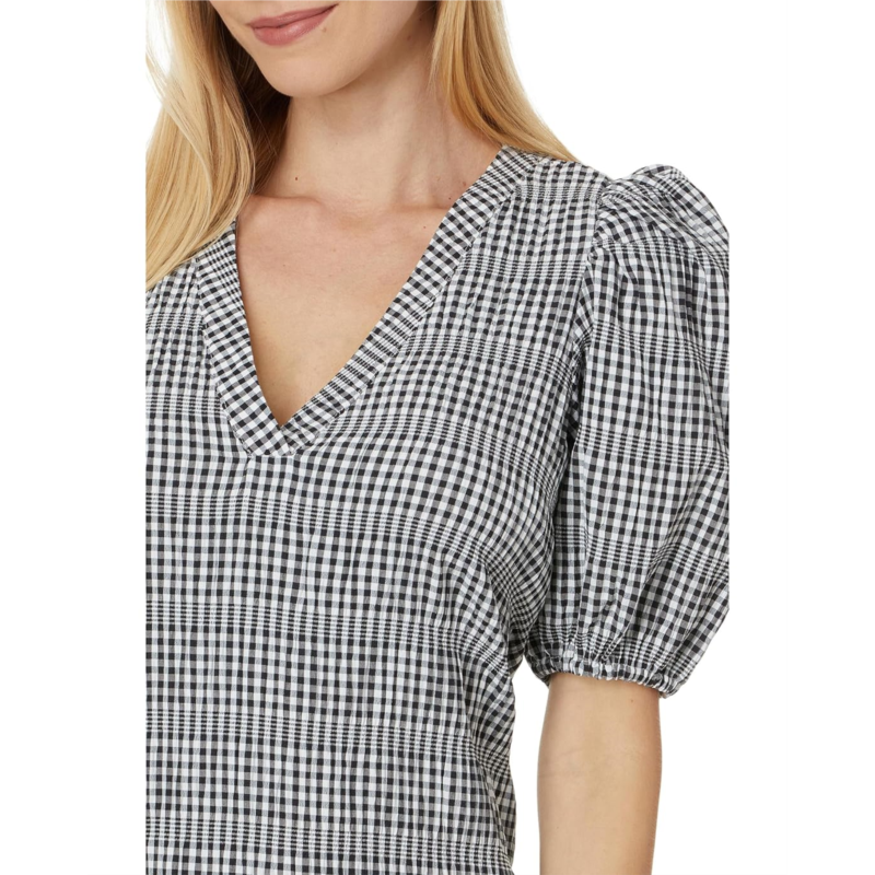 Complement your feminine aesthetics and enjoy the soft touch of comfort wearing Calvin Klein Gingham Print Gauze Dress with Puff Sleeve Dress. The gingham gauze dress features a deep V-neckline, short puff sleeves, exquisite allover checkered print, one-tiered design, and above-the-knee silhouette.