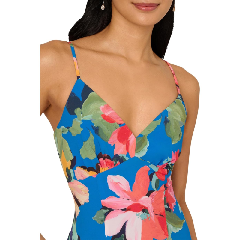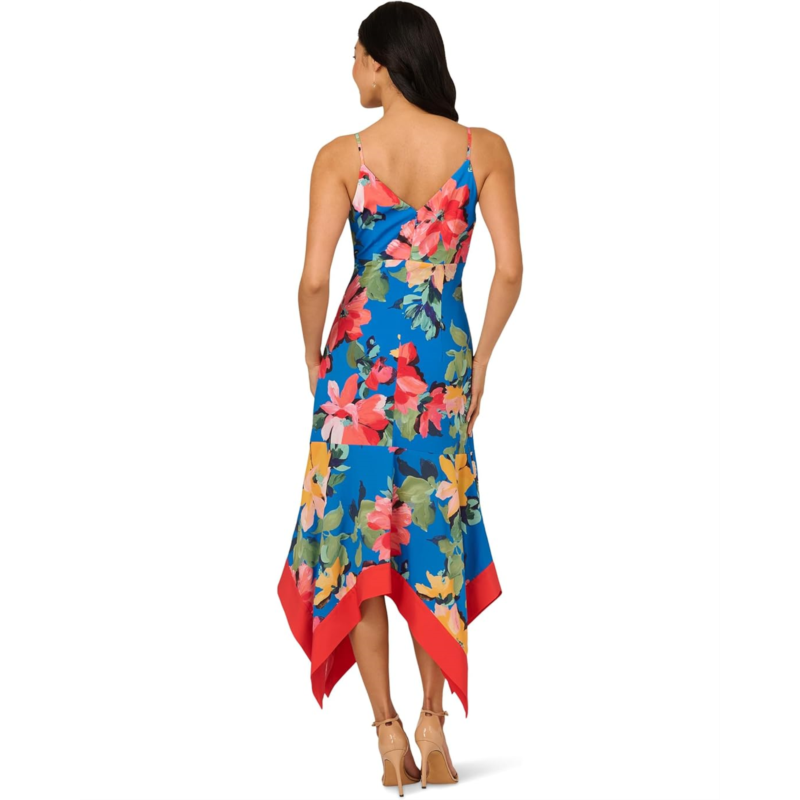 Look effortlessly versatile and elegant wearing the Adrianna Papell Handkerchief Floral Midi Dress. This dress features V-neckline, sleeveless style with spaghetti straps, allover printed design, handkerchief hem slip dress.