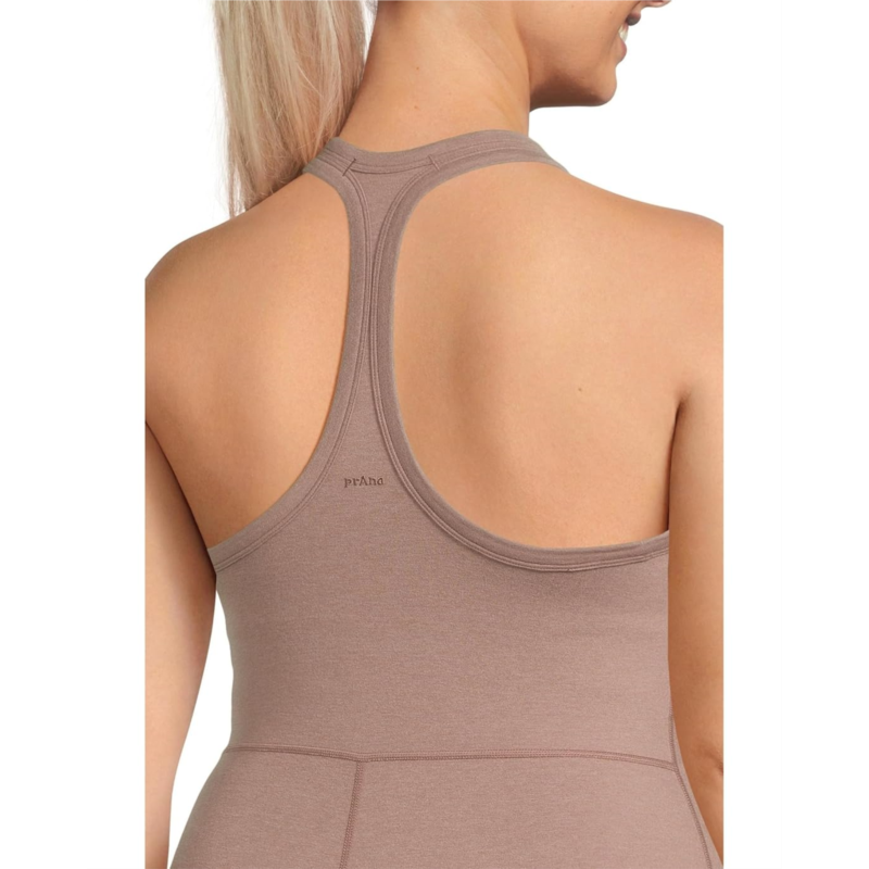 Move like a diva wearing the prAna Heavana Racerback Midi Dress. Crafted using moisture wicking fabric, this dress features scoop neckline, racerback style, midi-length silhouette, and sleeveless construction. It comes with binding detail at armholes and neck line, interior shelf bra with mesh lining and plush elastic.