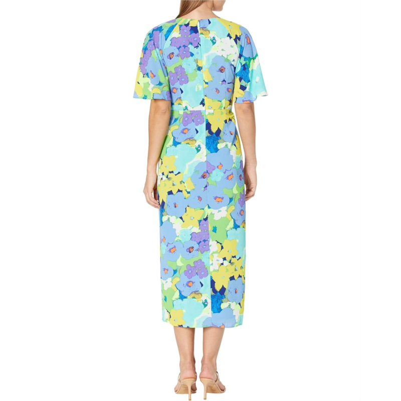 The Maggy London Faux Wrap Midi Dress is accentuated with subtle floral prints and a wrap-up layout that complements a flattering figure.