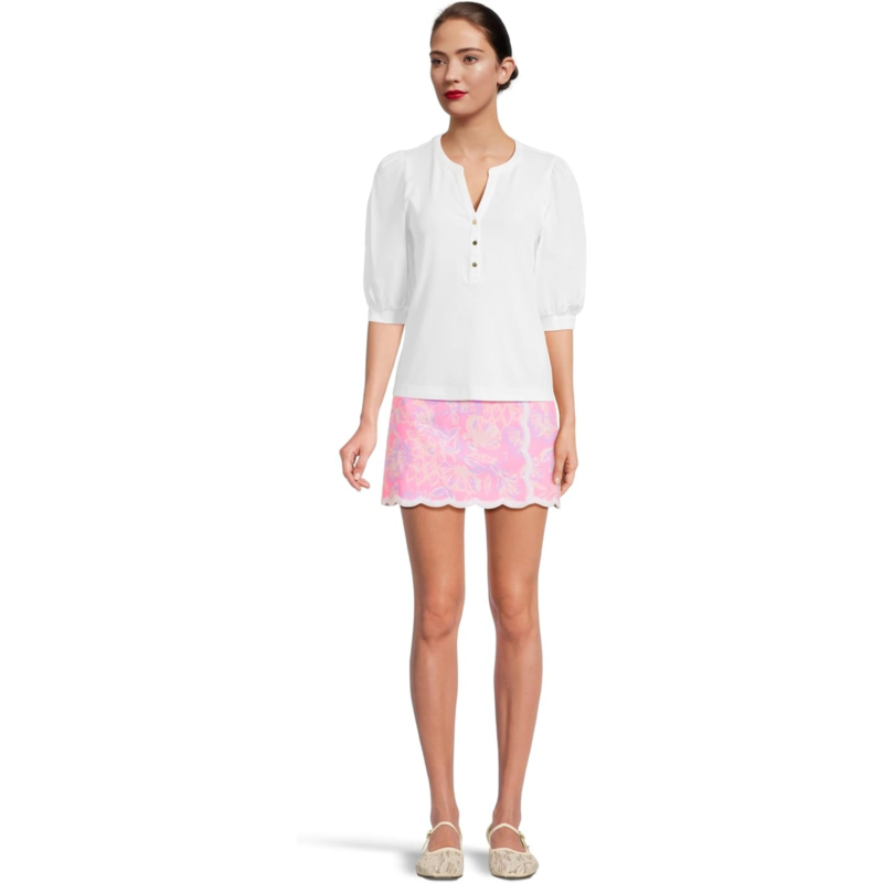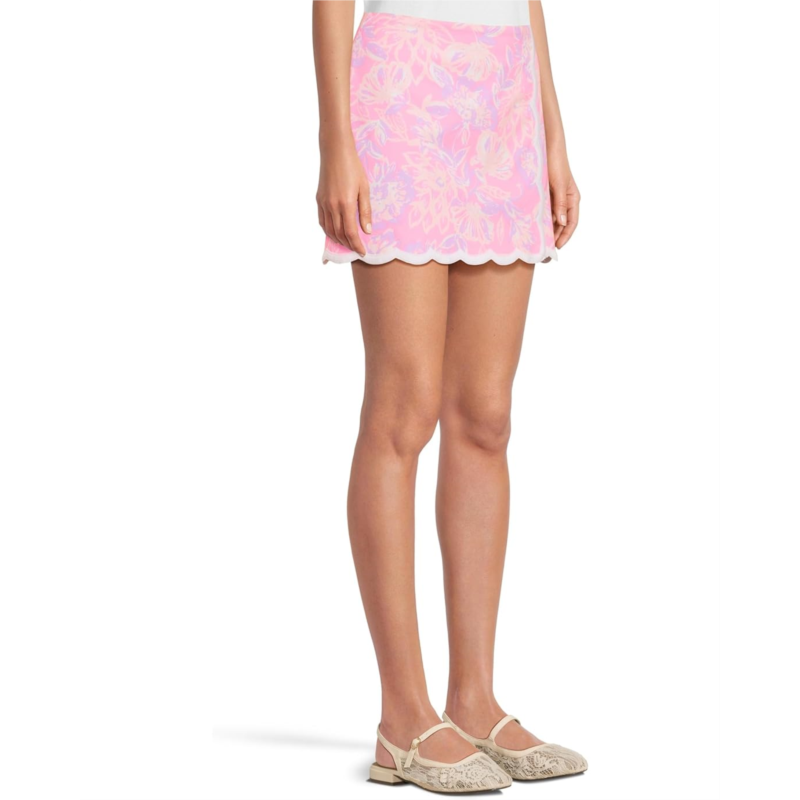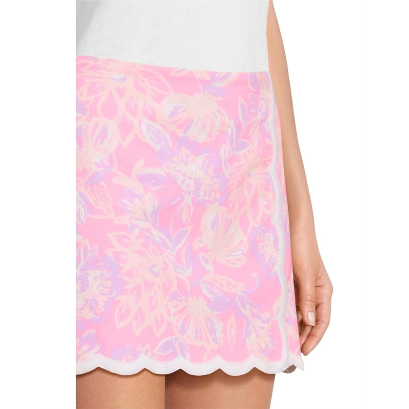 Slay a stylish look by wearing Lilly Pulitzer Michelina Mini Skort. The pull-on style skort has a scallop detail with back zipper closure for a custom fit. The skort has a skirt back design, anove-the-knee length, and the standard fit. The intricate floral print elevates the overall look, making this mid-rise skort perfect to pair with your casual tee and sneakers.