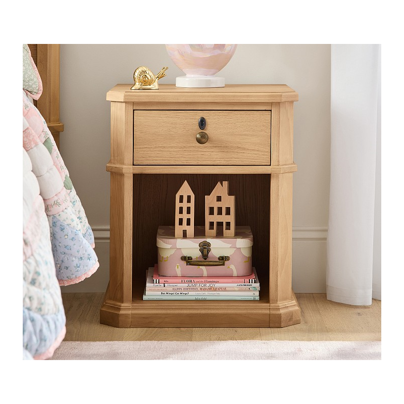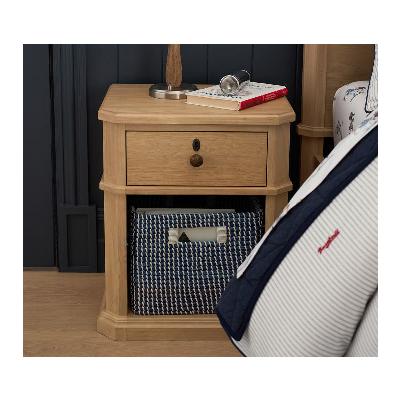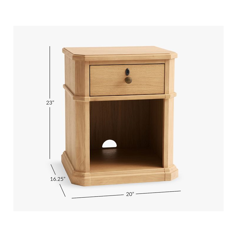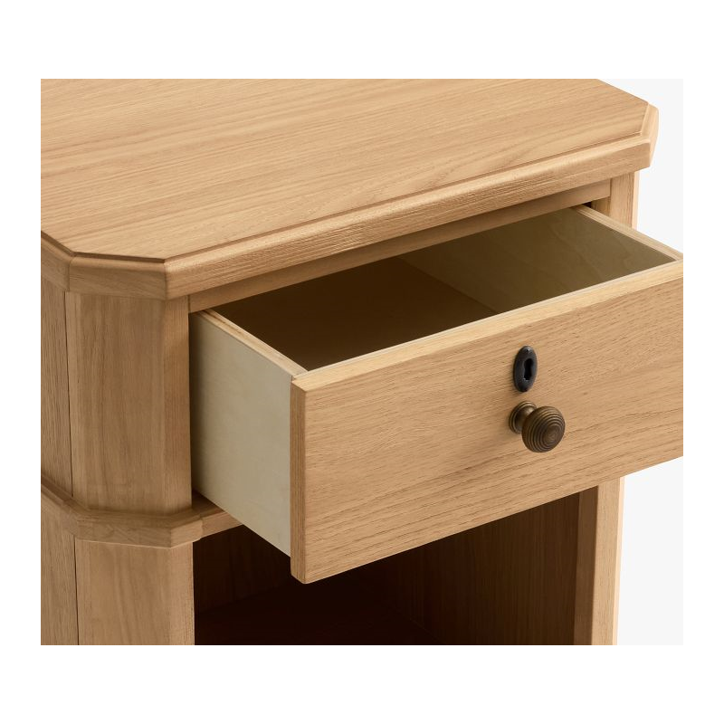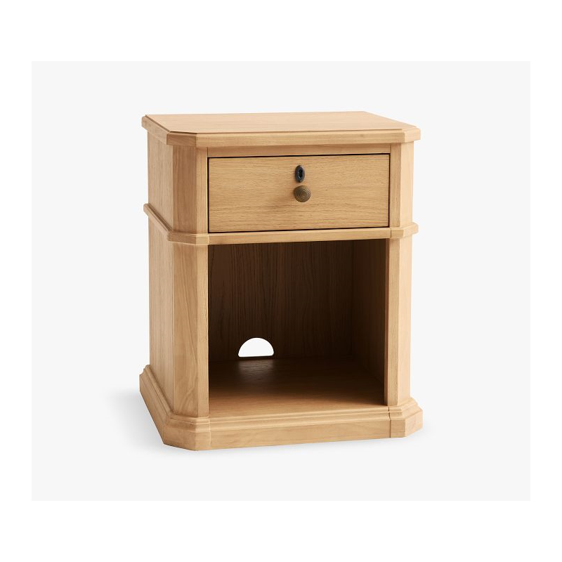 Vintage design gets a modern update in our versatile Wesley Collection. Angled molding and cut corners frame this spacious nightstand, adding a unique design detail to their space. Crafted with a deep drawer and an open cubby with cord management, it’s built from made-to-last materials and beautifully finished with oak veneer and antique brass hardware for a timeless look that complements any decor.